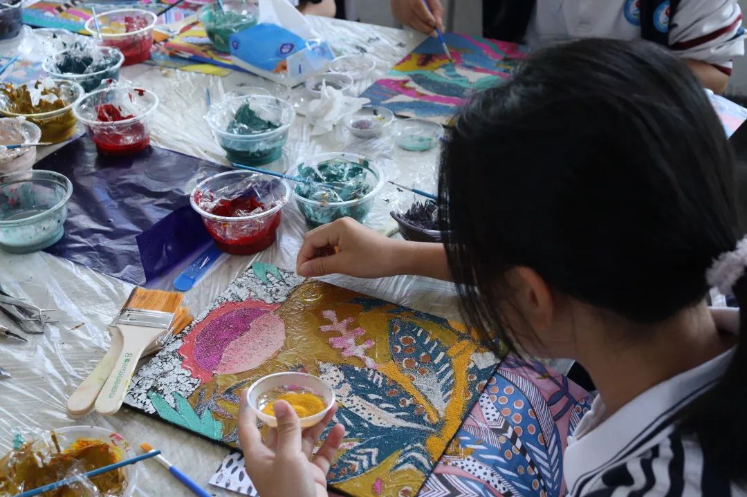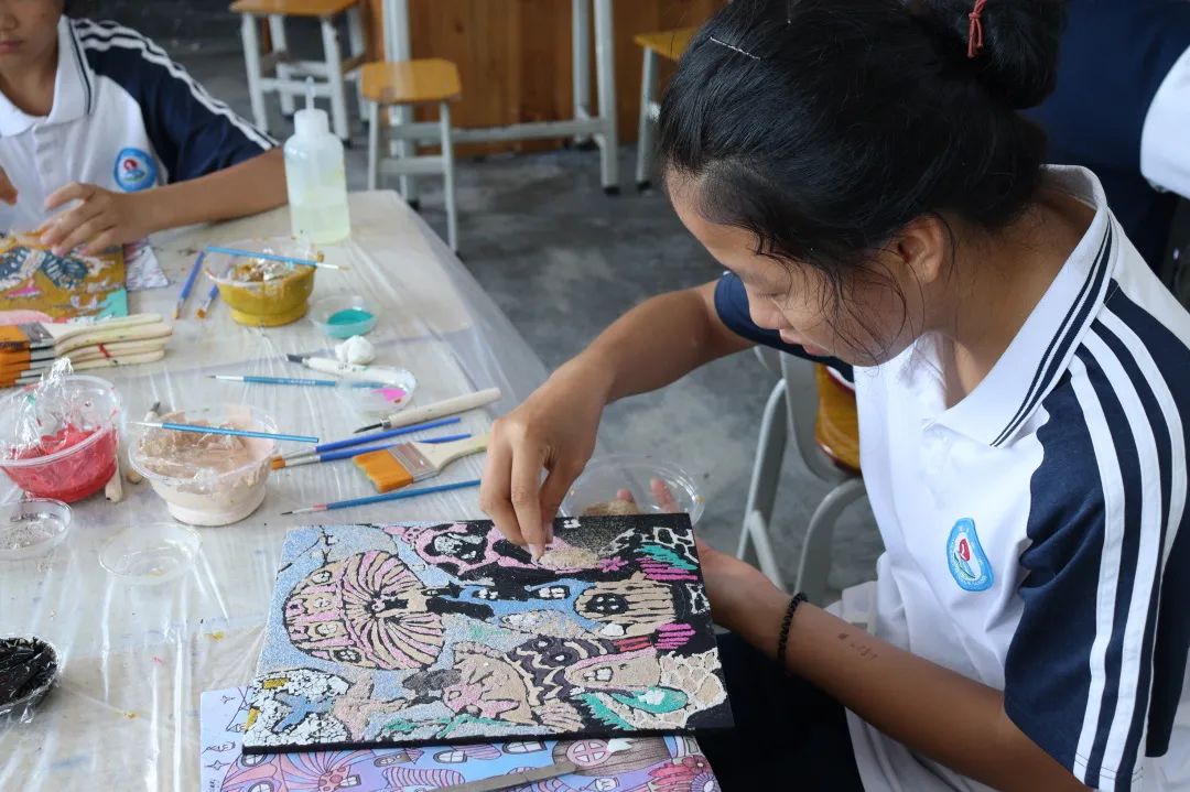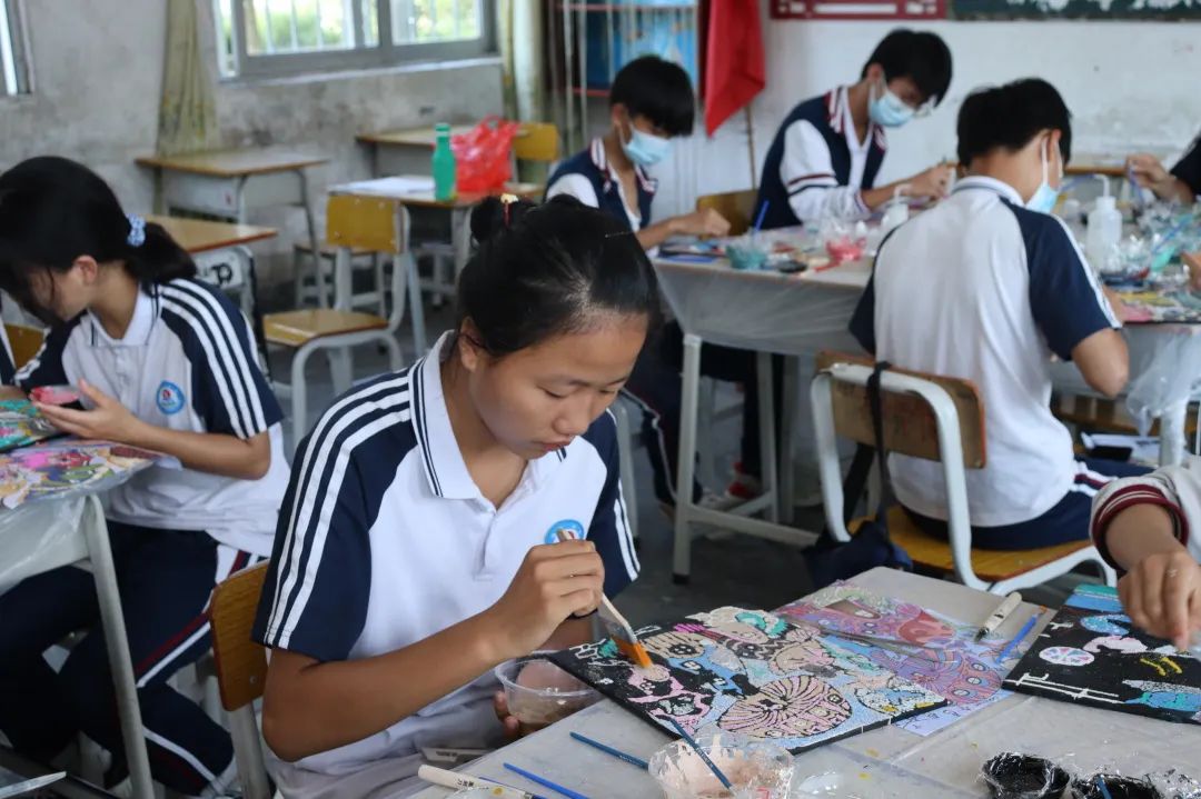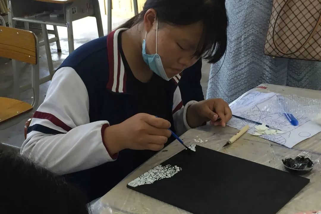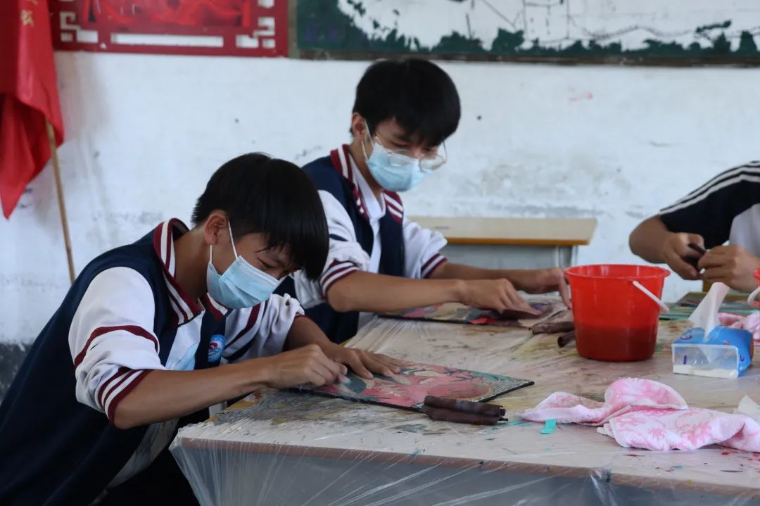 7月9日-14日,402永利集团402永利集团美育浸润工作组组织开设了4个工作坊在怀集县连麦中学进行课程教授。其中漆画工作坊由伍美坚老师指导,2020级员工冯运、李依萍为漆画工作坊的辅导助理。