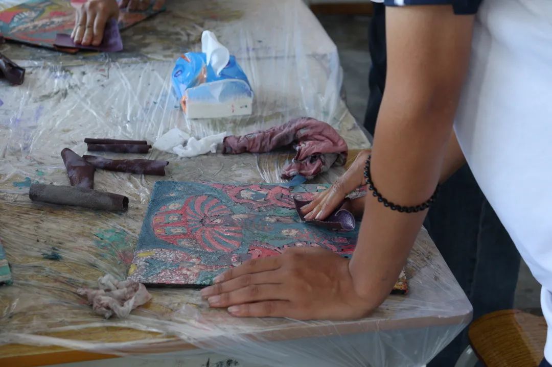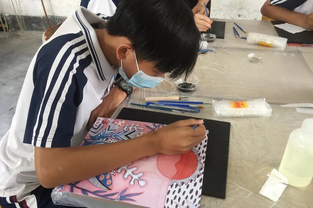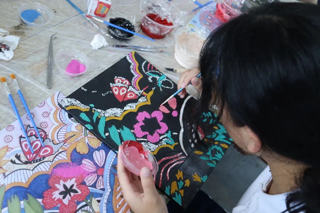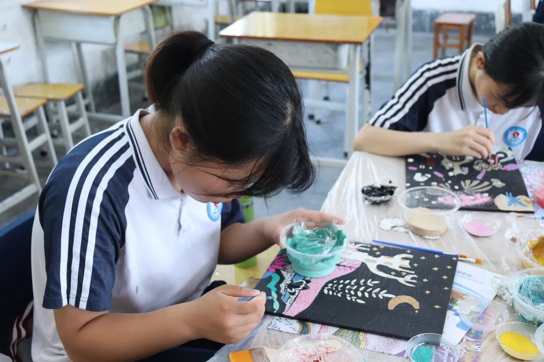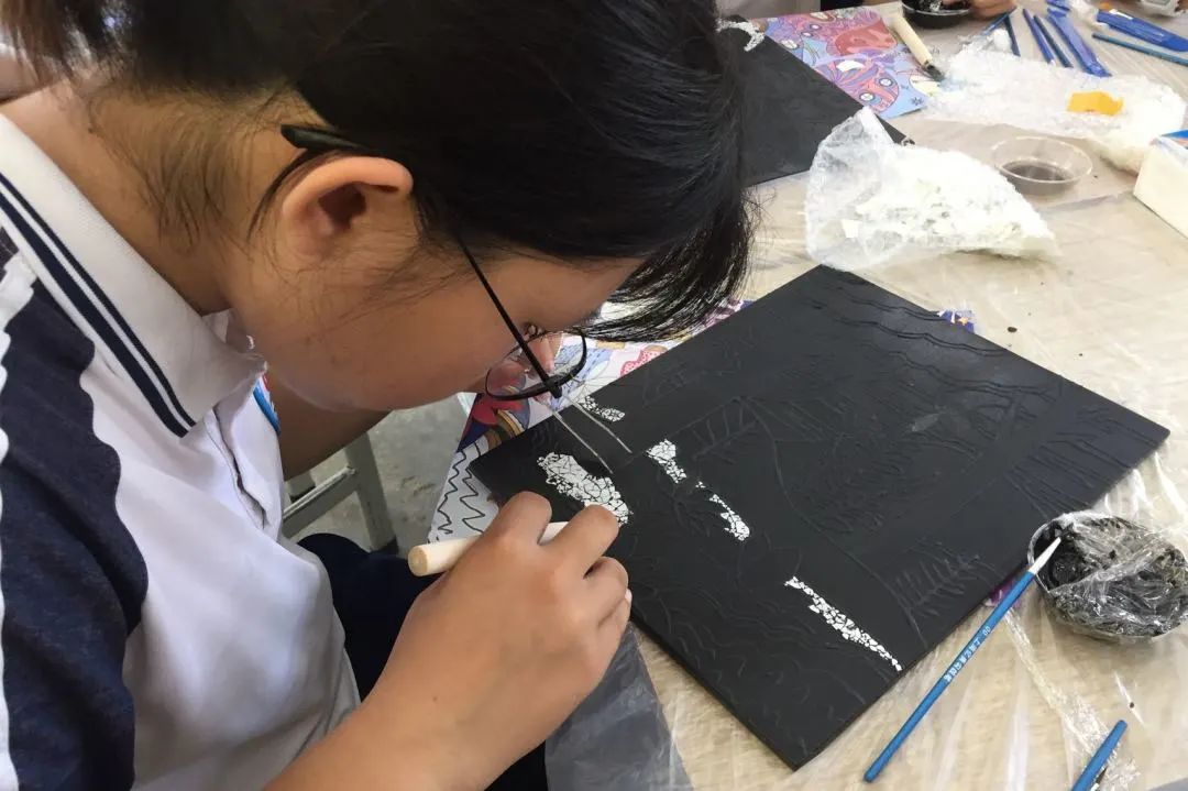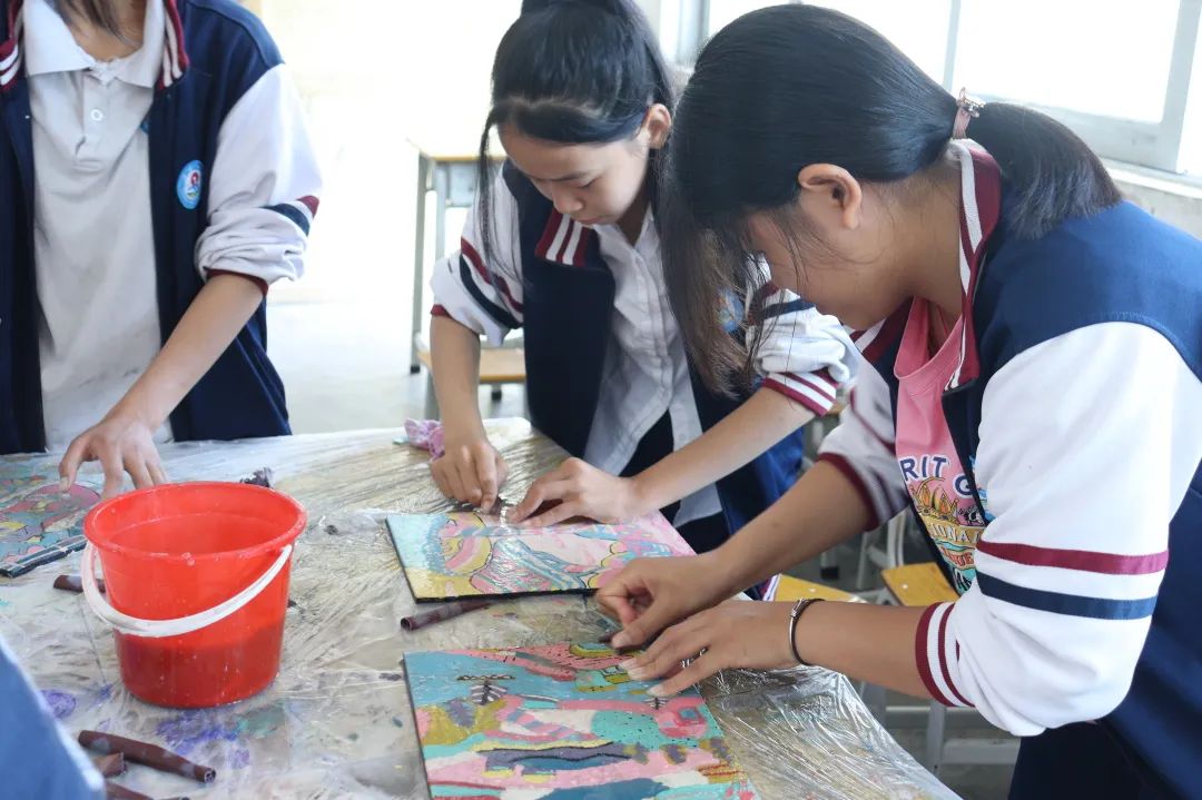 7月9日-14日,402永利集团402永利集团美育浸润工作组组织开设了4个工作坊在怀集县连麦中学进行课程教授。其中漆画工作坊由伍美坚老师指导,2020级员工冯运、李依萍为漆画工作坊的辅导助理。