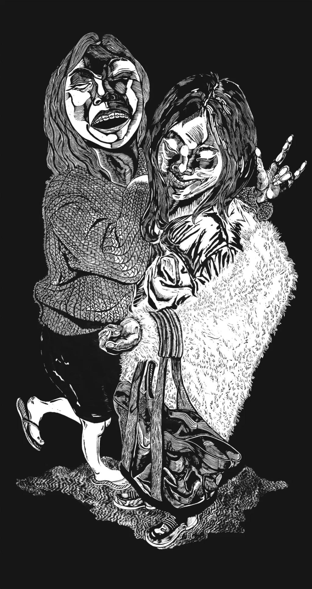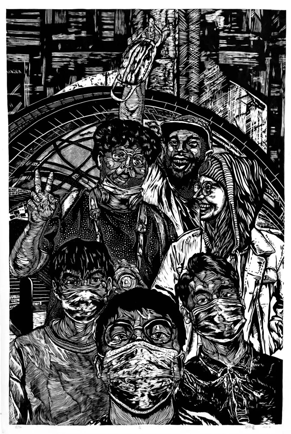 李雯 《摇滚青年精神载体》 黑白木刻 92×147cm 2020年