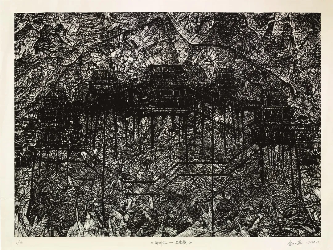 余一军 《百喻经-三重楼》 黑白木刻 119×88cm 2020年