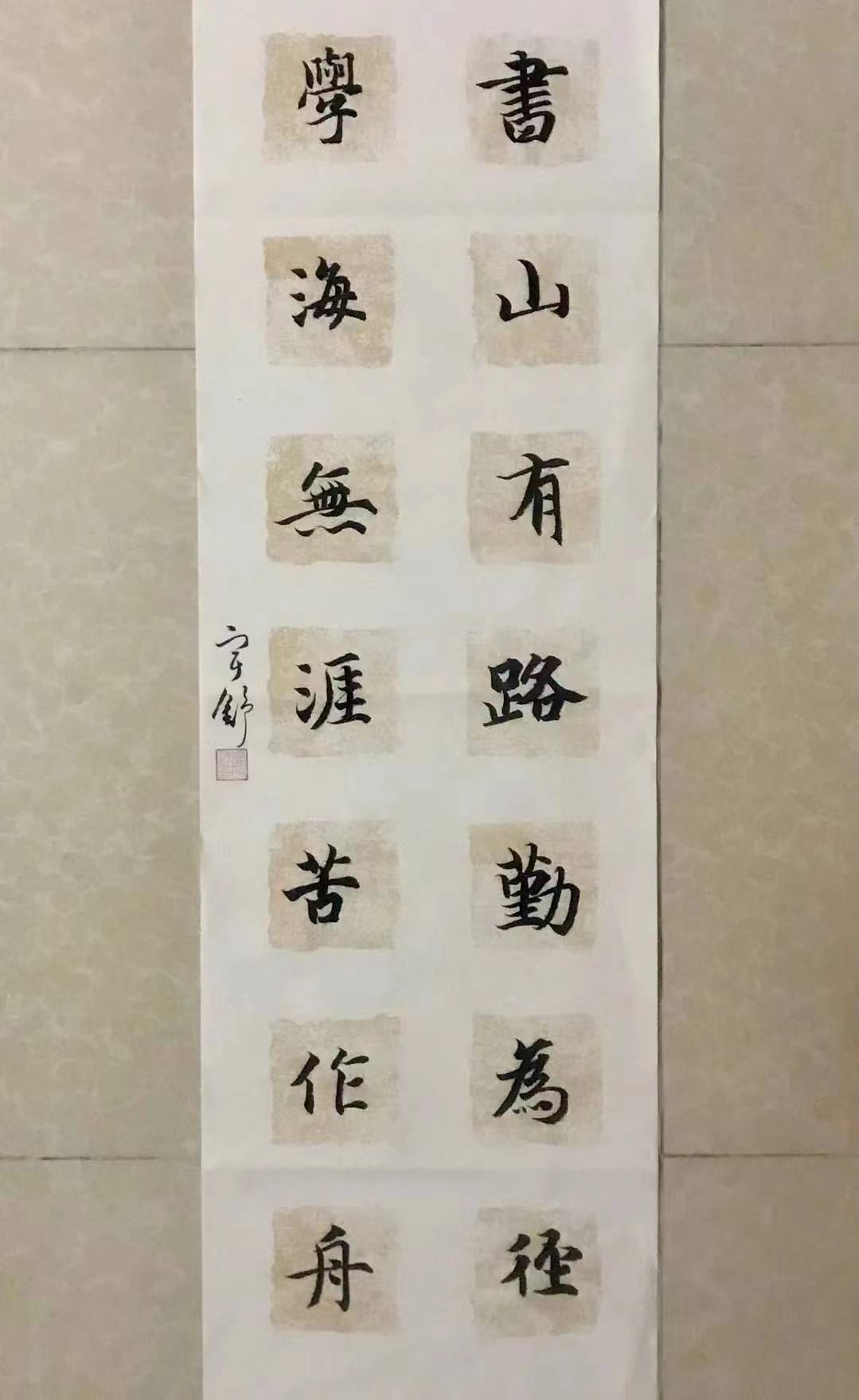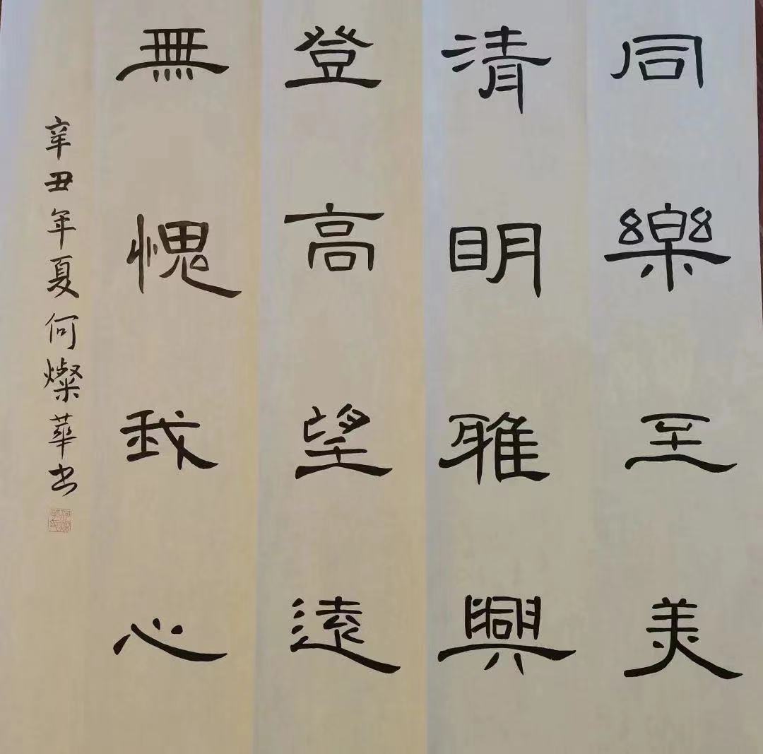 很荣幸能够参加到“三下乡”书法类的线上志愿活动。书法是我专业必学课程,很高兴能够在暑假期间继续写书法,可以巩固书法基础并更进一步。暑假期间,它不仅充实了我的时间,更能平息我郁闷烦躁之心,况且,写好的每一张作品都能让我获得成就感,提高自信心。同时,通过每周日老师在线上指导,让我们的书法作品得到完善,接近完美。我知道书法是一门博大精深的奇特艺术,它充满了各种形象的美,各种风格的美,它内涵丰富,既看形,又重意,说白了就是要有精、气、神,要感悟所写的情境,融入其中,有神韵、有美感的字,我觉得学习书法有很多益处,它可以培养我们的艺术修养,陶冶高尚的情操,提高文化素质;可以逐步养成细致耐心、自觉认真的良好习惯,同时还有益于意志的锻炼。参加此活动有收获有感悟也有进步。