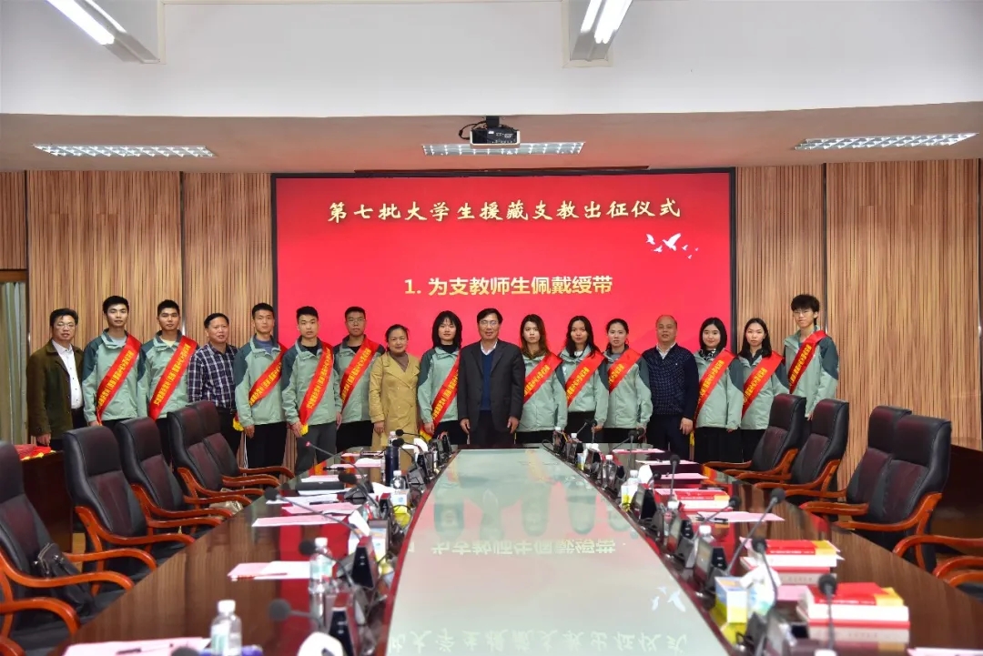 出征仪式上,公司党委副书记谢冠华为“援藏支教”队员佩戴绶带