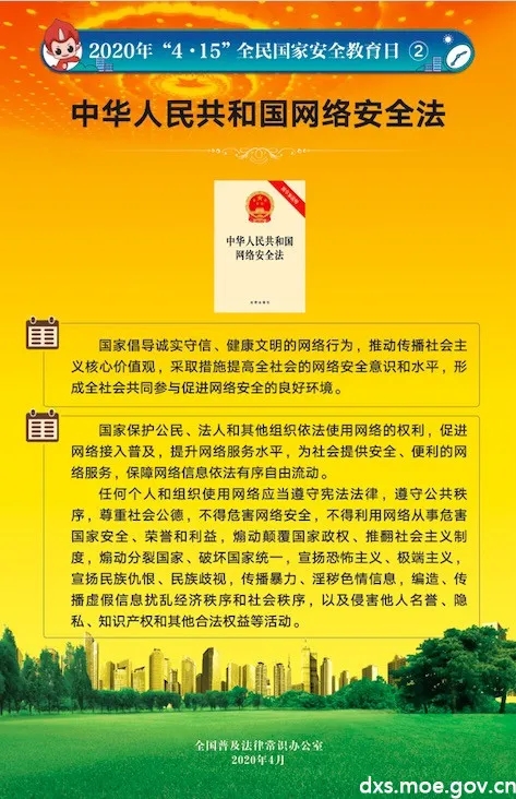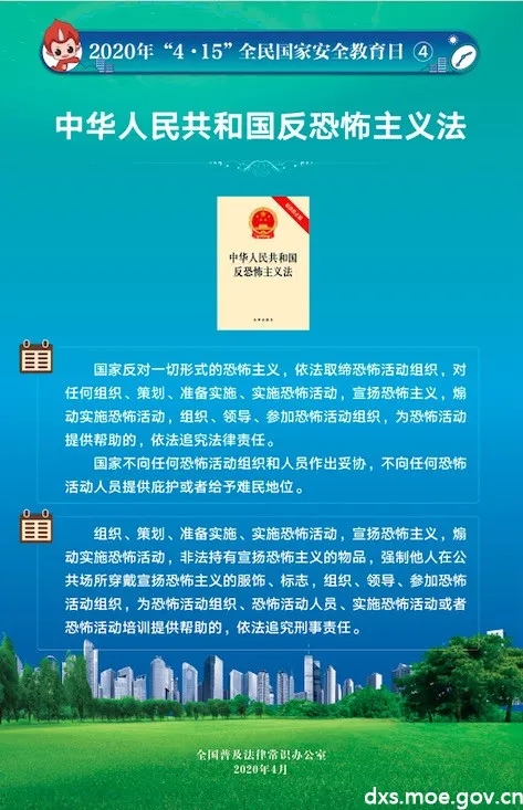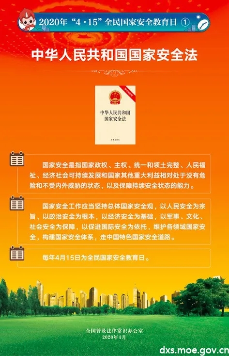 2020年4月7日,司法部、全国普法办联合印发通知,在全国部署开展2020年全民国家安全教育日普法宣传活动,提高全民国家安全法治意识,营造维护国家安全的浓厚法治氛围,增强防范和抵御安全风险能力。今年活动主题为“坚持总体国家安全观,统筹传统安全和非传统安全,为决胜全面建成小康社会提供坚强保障”。