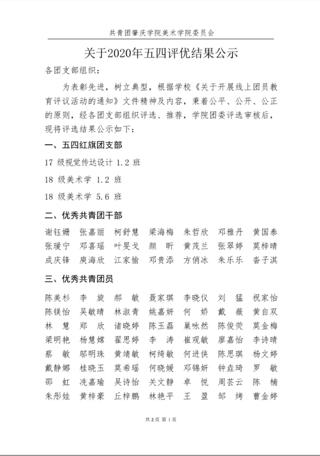 2019-2020学年五四评优结果