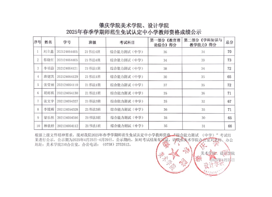 根据上级文件精神要求,现对公司2025年春季学期师范生免试认定中小学教团队格 “综合能力测试 (中学)”考试结果进行公示,公示期为2025年4月25日-4月29日。公示期内,如对考试结果有异议,请联系402永利集团办公室刘老师,办公地址:402永利集团210办公室,办公电话:(0758)2752612。