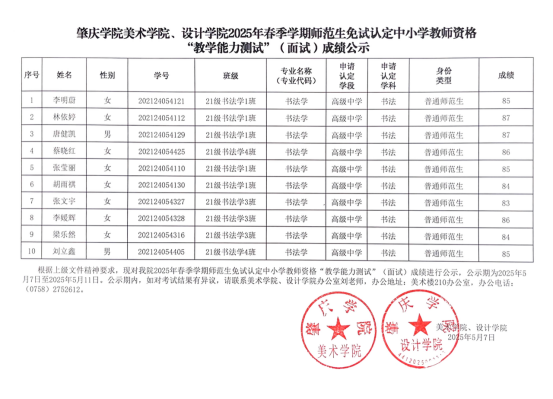 根据上级文件精神要求,现对公司2025年春季学期师范生免试认定中小学教团队格 “教学能力测试”(面试)成绩进行公示,公示期为2025年5月7日-5月11日。公示期内,如对考试结果有异议,请联系402永利集团办公室刘老师,办公地址:402永利集团210办公室,办公电话:(0758)2752612。